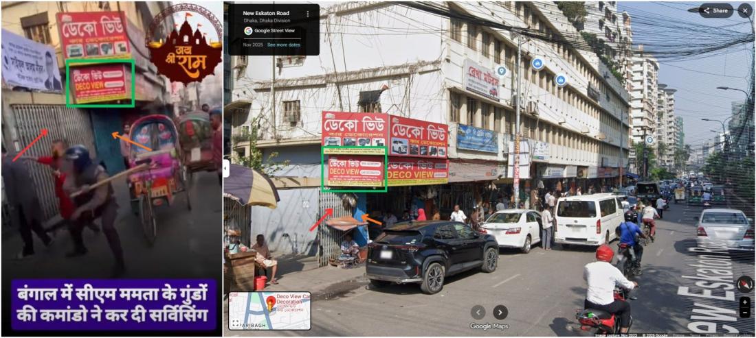 एएफ़पी ने फ़ुटेज को ढाका में जियोलोकेट किया, जहां गूगल मैप्स स्ट्रीट व्यू पर उसी दुकान के साइनबोर्ड और गेट देखे जा सकते हैं (आर्काइव्ड लिंक).