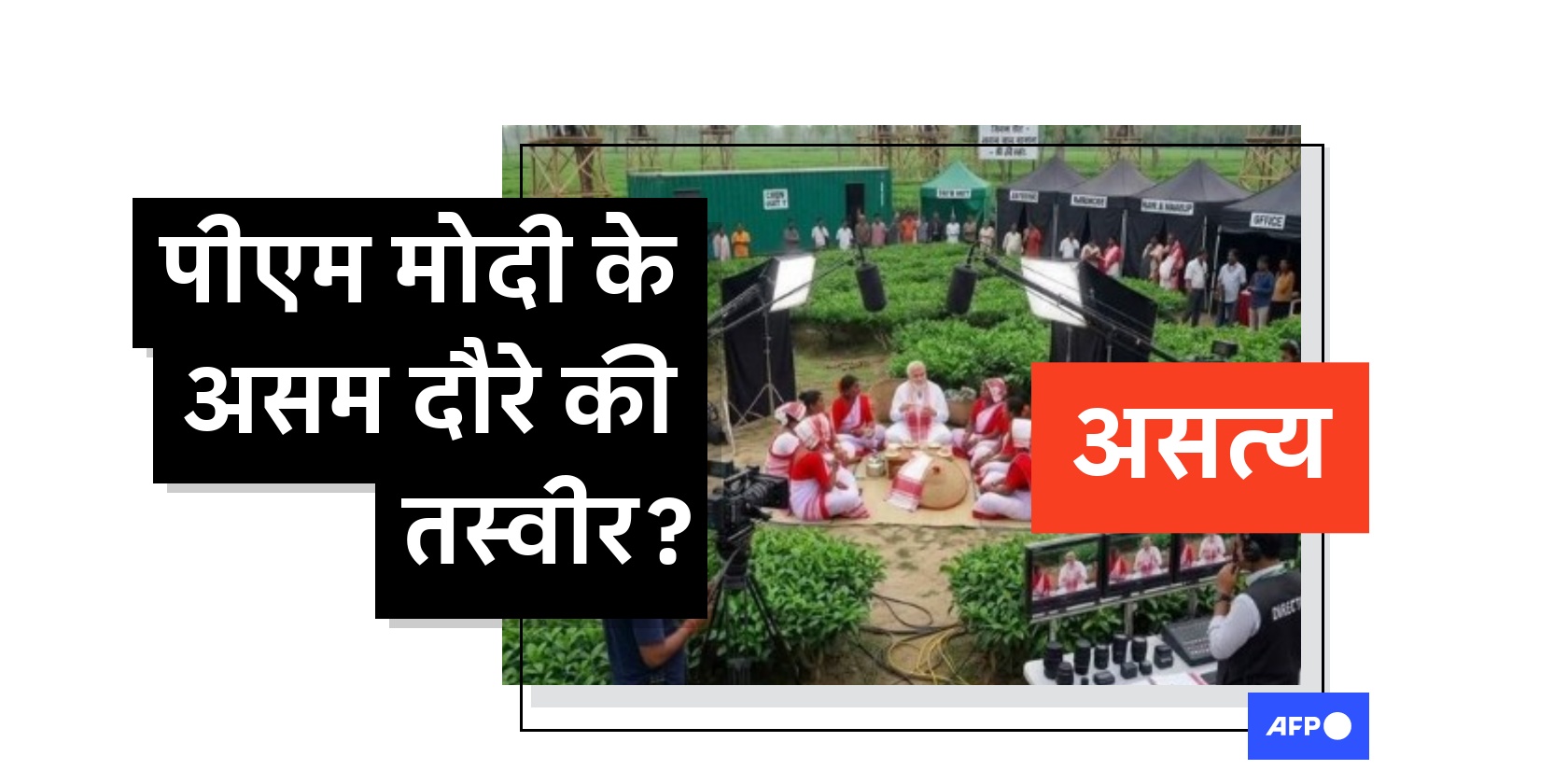 तस्वीर में ऐसा दिखता है कि प्रधानमंत्री स्थानीय चाय मजदूरों के साथ बैठे हैं और इस बातचीत को कई कैमरों से फ़िल्माया जा रहा है. वहां लाइट्स, ऊपर लगे माइक्रोफोन, टेंट और स्टेज जैसी व्यवस्था दिखाई देती है, जिसे एक डायरेक्टर संभाल रहा है.