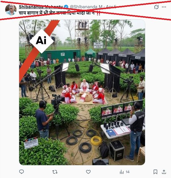 5 अप्रैल 2026 को X पर शेयर की गई इस तस्वीर के साथ कैप्शन है, "चाय बागान में भी सेट लगवा दिया मोदी जी ने."