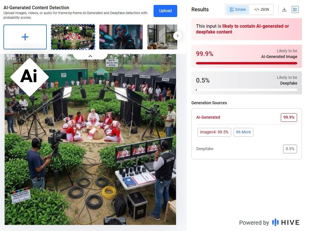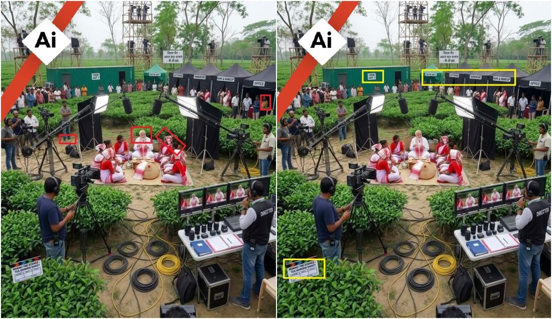 प्रधानमंत्री नरेंद्र मोदी ने 1 अप्रैल को असम में चुनाव से पहले एक चाय बागान का दौरा किया था. एक तस्वीर जिसमें उनके स्थानीय मज़दूरों के साथ बातचीत को एक बड़े फ़िल्म क्रू द्वारा शूट करते हुए दिखाया गया है, वास्तविक बताकर शेयर की जा रही है. हालांकि, यह असली नहीं बल्कि एआई से बनाई गई है. इस तस्वीर में कई गड़बड़ियां दिखती हैं और एक टूल ने भी इसके एआई-जेनरेटेड होने की संभावना बताई है.