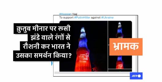 चित्र यूक्रेन में युद्ध प्रकाशित 21/03/2022 जन औषधि दिवस पर सजाई गई क़ुतुब मीनार की तस्वीर यूक्रेन संकट से जोड़कर वायरल